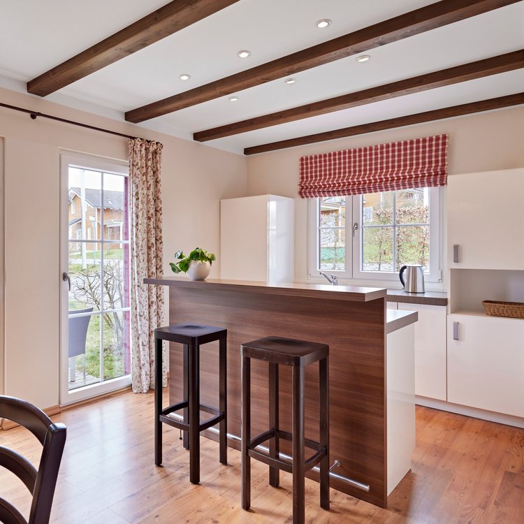 Enjoy your time out to the full as the open fire crackles cozily. Villa 6 Comfort is 95 m² in size and can accommodate up to 6 people. The cozy living area invites you to chill out together and the terrace is perfect for social gatherings. There is also plenty of space for four-legged friends to loll around in the sun after a long walk.